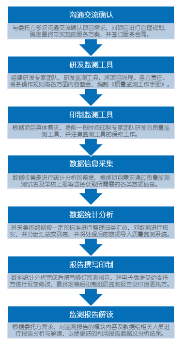 2008年,國(guó)內(nèi)開始了國(guó)家級(jí)教育質(zhì)量監(jiān)測(cè)的研究;2009年公司聘任相關(guān)專家參與了最初的質(zhì)量監(jiān)測(cè)指標(biāo)的修訂,并作為國(guó)家視導(dǎo)員先后5年參與了在貴州、內(nèi)蒙、寧夏等地的質(zhì)量監(jiān)測(cè)試點(diǎn)工作。公司在參考國(guó)家質(zhì)量監(jiān)測(cè)標(biāo)準(zhǔn)的基礎(chǔ)上,以不低于國(guó)家教育質(zhì)量監(jiān)測(cè)標(biāo)準(zhǔn)進(jìn)行,另外還參考了國(guó)際幾大主流機(jī)構(gòu)測(cè)評(píng)方法。