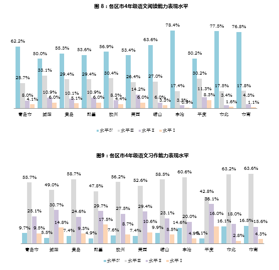 監(jiān)測采用分層整群隨機抽樣,先將青島市按照行政區(qū)劃分為了10個抽樣分樣本,根據(jù)各區(qū)市的地理位置、城鄉(xiāng)學(xué)生比例、教育經(jīng)濟發(fā)展狀況、學(xué)校類型等因素在每個區(qū)市中隨機抽取12所學(xué)校,每個學(xué)校抽取4年級(由于測試時間為2015年1月,實際測試目標群體已升入5年級,但測試內(nèi)容仍為4年級所學(xué)內(nèi)容)60名學(xué)生(不足60人按照實際人數(shù))進行語文學(xué)業(yè)水平測試以及學(xué)生調(diào)查問卷的填答。本次調(diào)查問卷同時包括樣本校的340名語文教師和120名校長。
